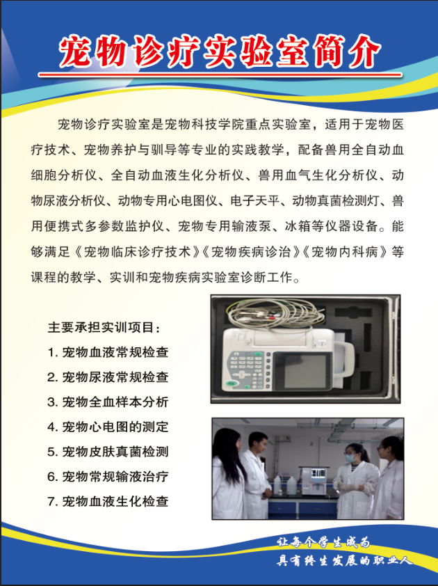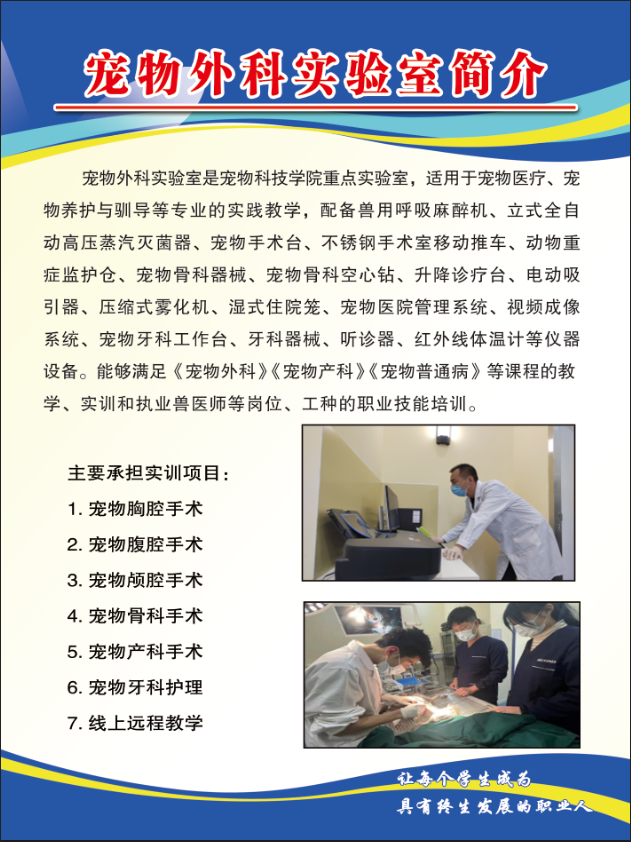 康尔贝宠物医院是校企共建宠物医院,2021年9月建成。宠物医院置了全科门诊、特色专科门诊、手术室、DR室、化验室、住院部、药品仓库等医疗功能科室,以及宠物美容、毛发护理、造型修剪、用品食品销售、寄养、行为调教等养护服务区域。拥有手术台、无影灯、血细胞自动分析仪、血液生化分析仪、成像显微镜、B超机、高速离心机、高温灭菌器、骨科固定器械、外科手术器械四套、进口洗牙机、进口监护仪、PCR核酸检测仪等高端医疗设备,可开展宠物心脏、肾内科、神经外科、眼科和牙科等特色专科,为员工实践锻炼提供平台。