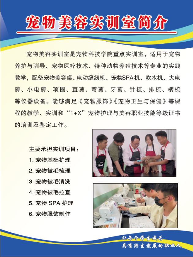 集团累计投入3000余万元,建成覆盖宠物产业全链条的实训体系,形成“教学-实训-就业”一体化平台,包括宠物外科、宠物诊疗、宠物美容等专业实训室集群和宠物养护与驯导基地、康尔贝宠物医院、宠物生活馆、宠物食品厂等综合实训基地,拥有省级就业名师工作室、省级“宠物美容与护理”技艺技能传承工作室。康尔贝宠物医院2022年以来累计接诊4000余次、手术1000多例、洗护3000余次,建立病例档案5000余份。