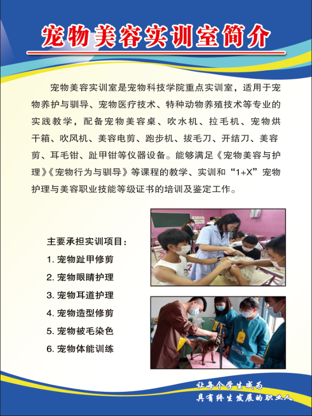 犬舍为饲养区,现饲养有金毛巡回猎犬、迷你贵宾犬、标准雪纳瑞犬等10余个名贵犬种30余只。美容区可以完成犬的洗澡、造型修剪、趾甲修剪等日常护理。在宠物养护与训导实训基地右侧核心训练区域,主要为犬服从行为、信号控制、玩赏表演、异常行为调整等教学和训练。训练实行国际动物保护组织倡导的“快乐训犬”理念,拒绝惩罚,以诱导、奖励的方式让狗狗轻松愉快的学习。